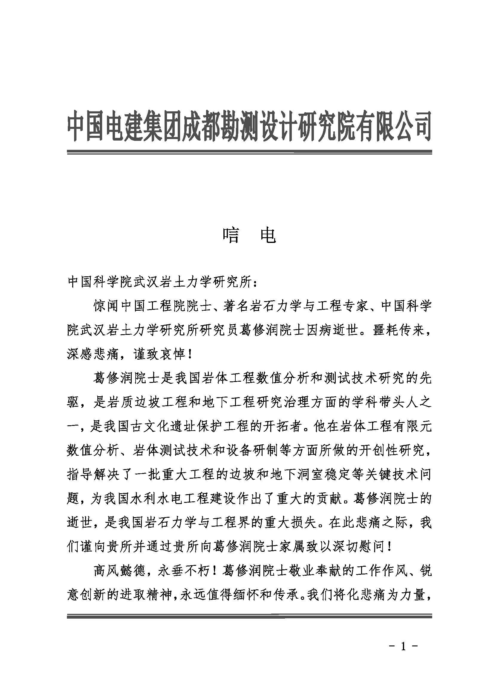 中国电建集团成都勘测设计研究院有限公司唁电