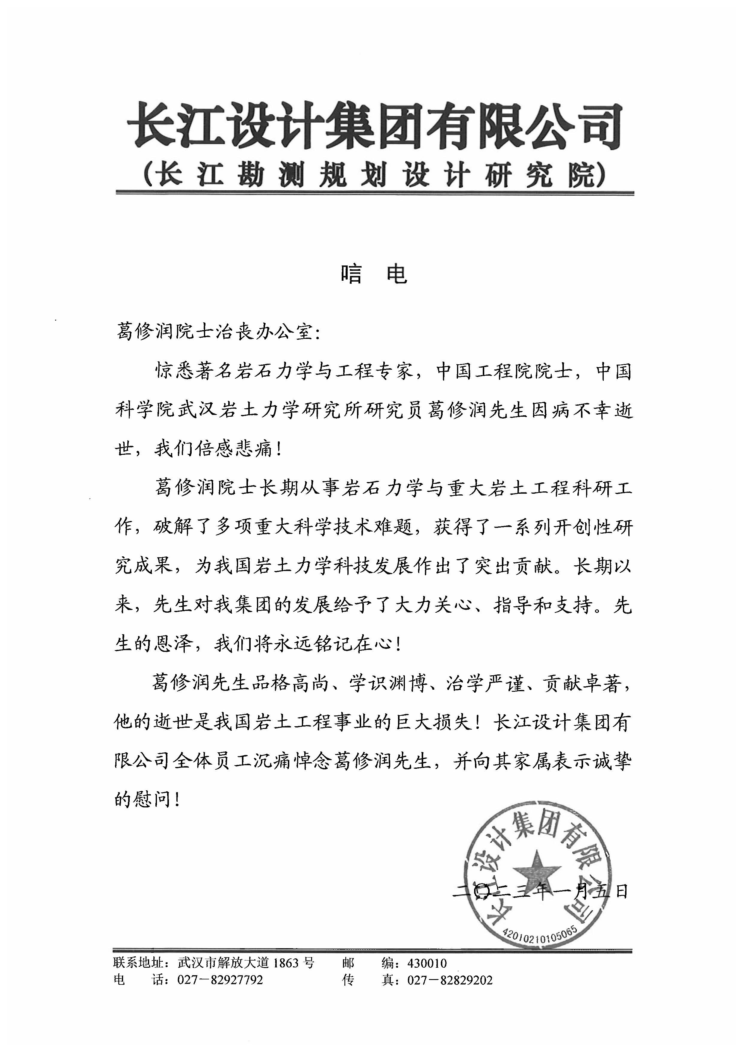 长江设计集团唁电