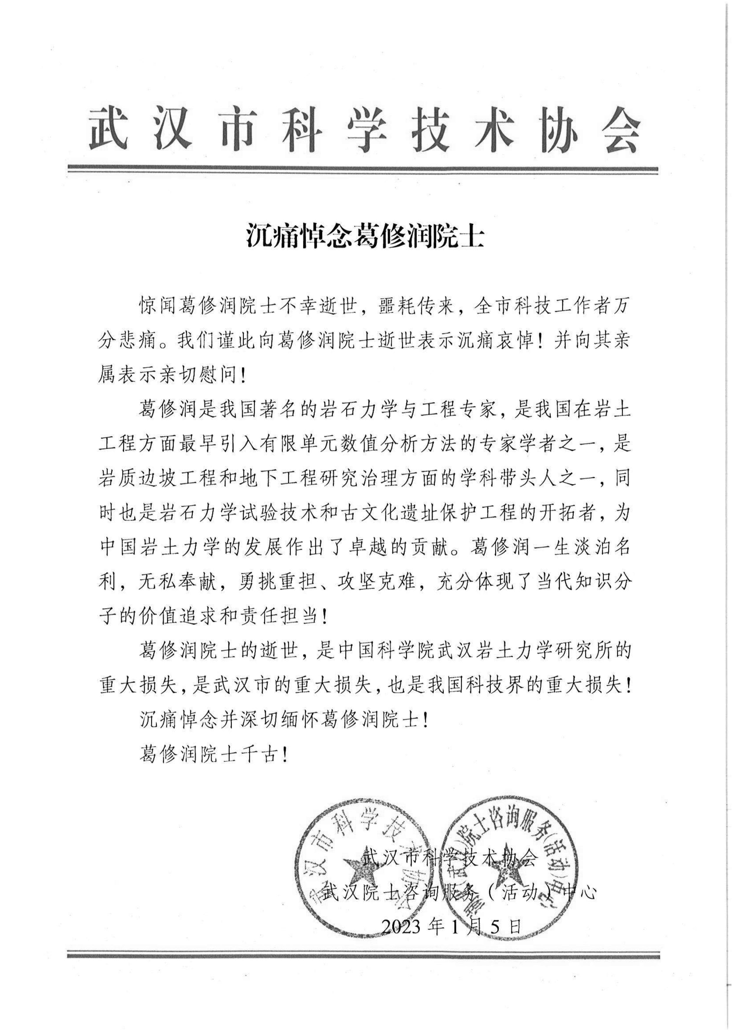 武汉市科学技术协会唁电