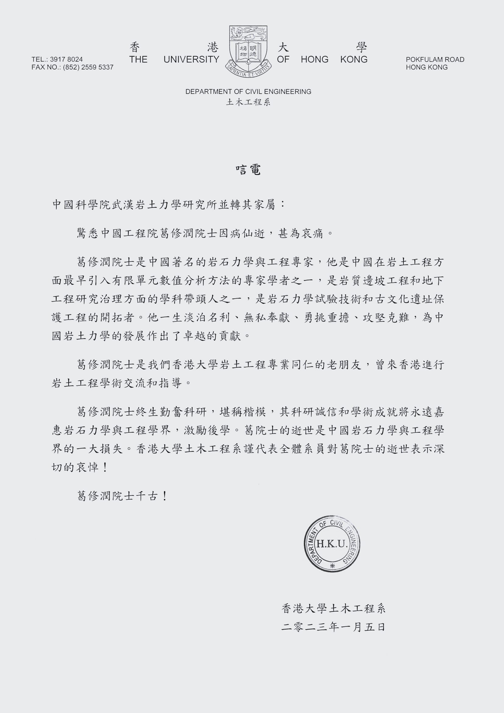香港大学土木工程系唁电