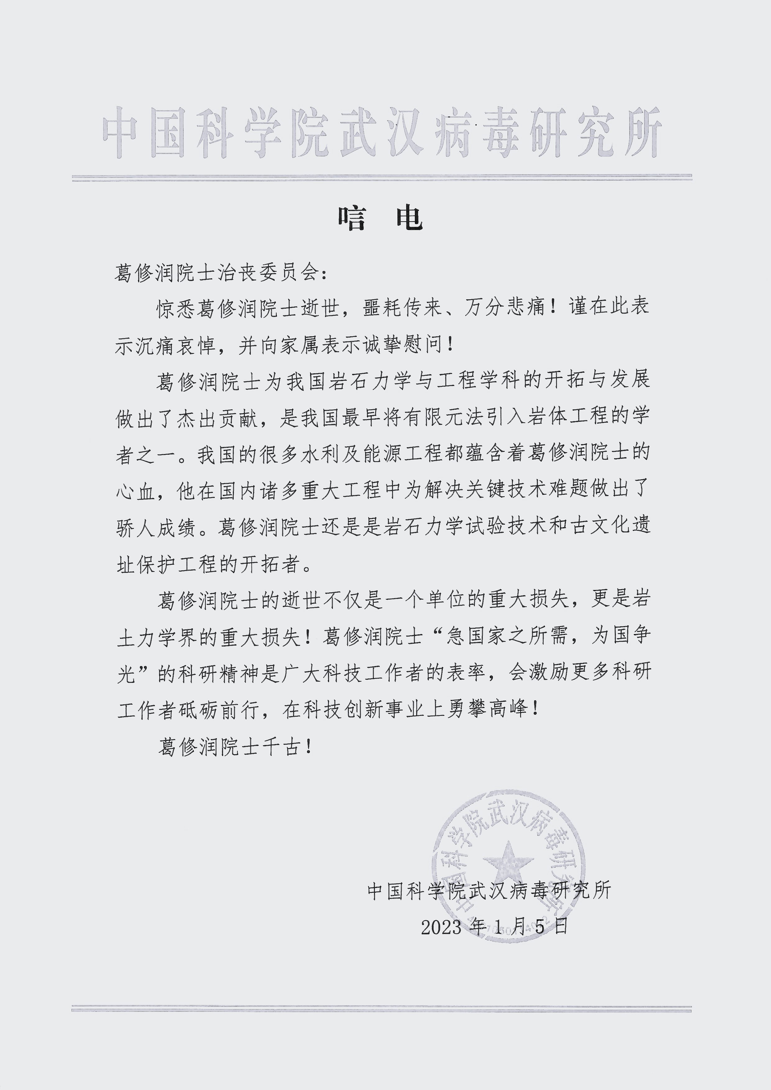 中国科学院武汉病毒研究所唁电