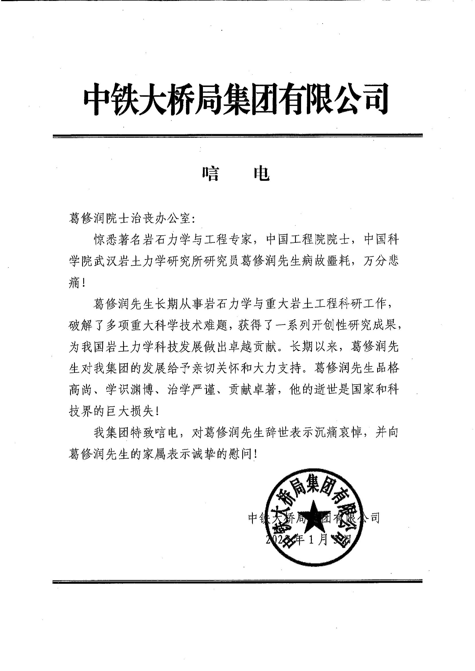 中铁大桥局唁电