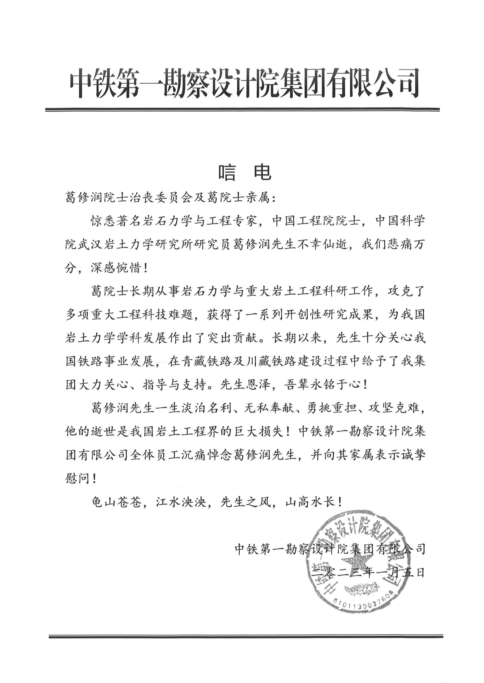 中铁第一勘察设计院集团有限公司唁电