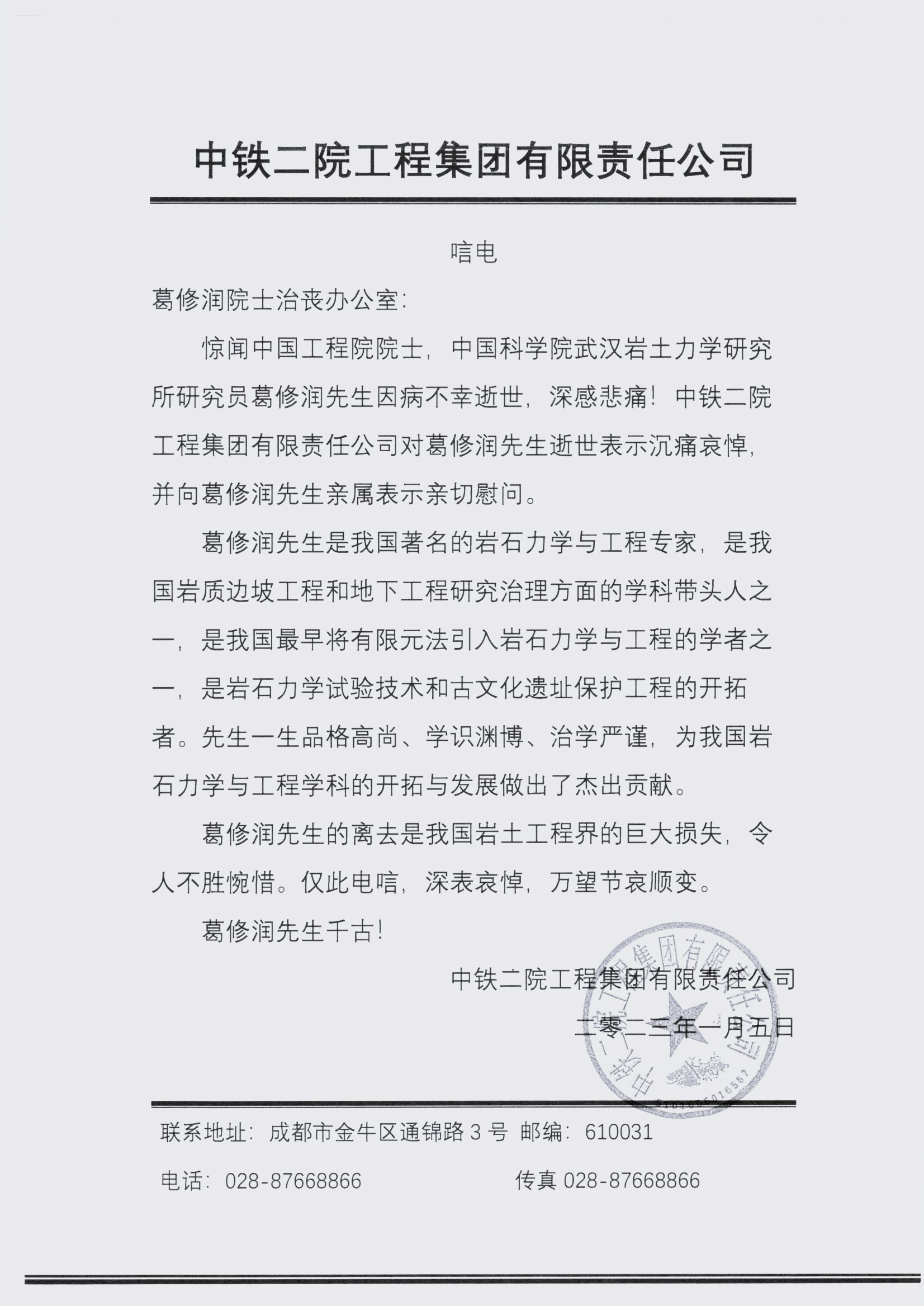 中铁二院工程集团有限责任公司唁电