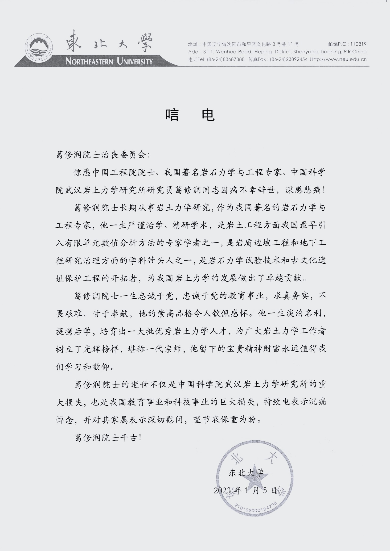 东北大学唁电
