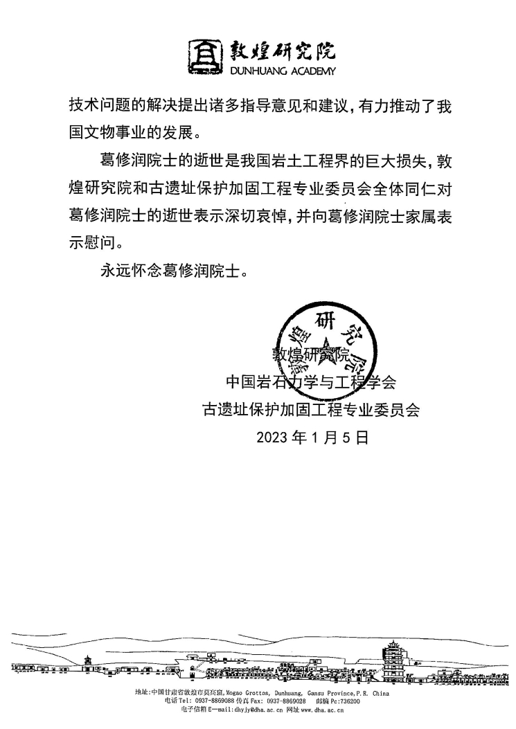 敦煌研究院(中国岩石力学与工程学会古遗址保护加固工程专业委员会)唁电
