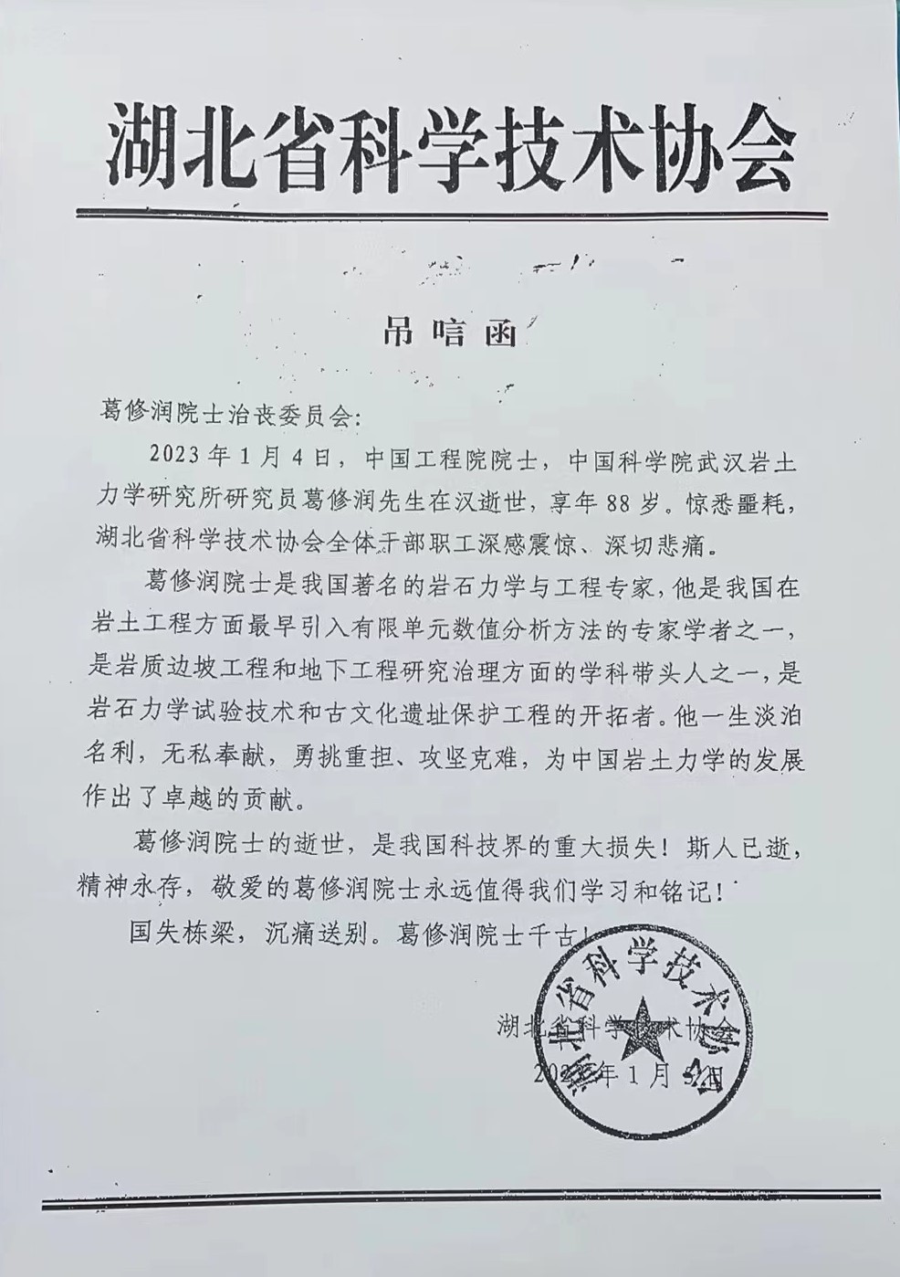 湖北省科学技术协会唁电