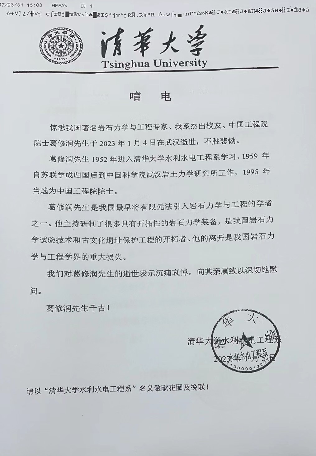 清华大学水利水电工程系唁电