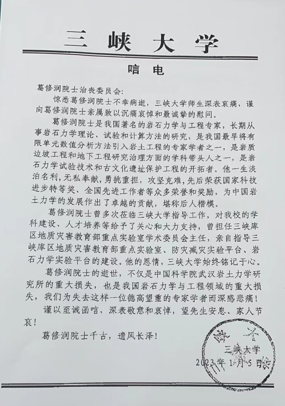 三峡大学唁电
