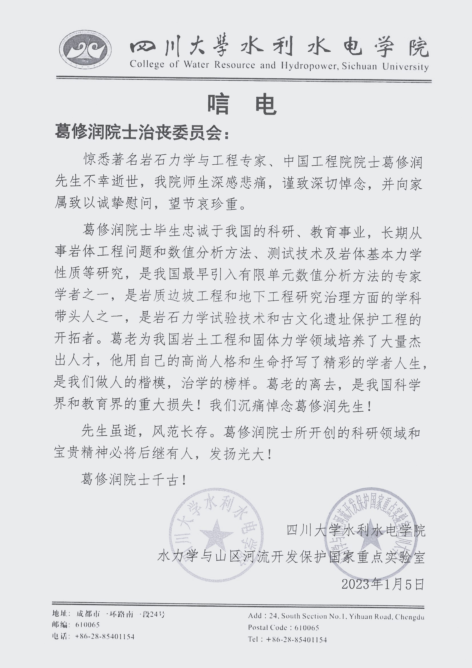 四川大学水利水电学院唁电