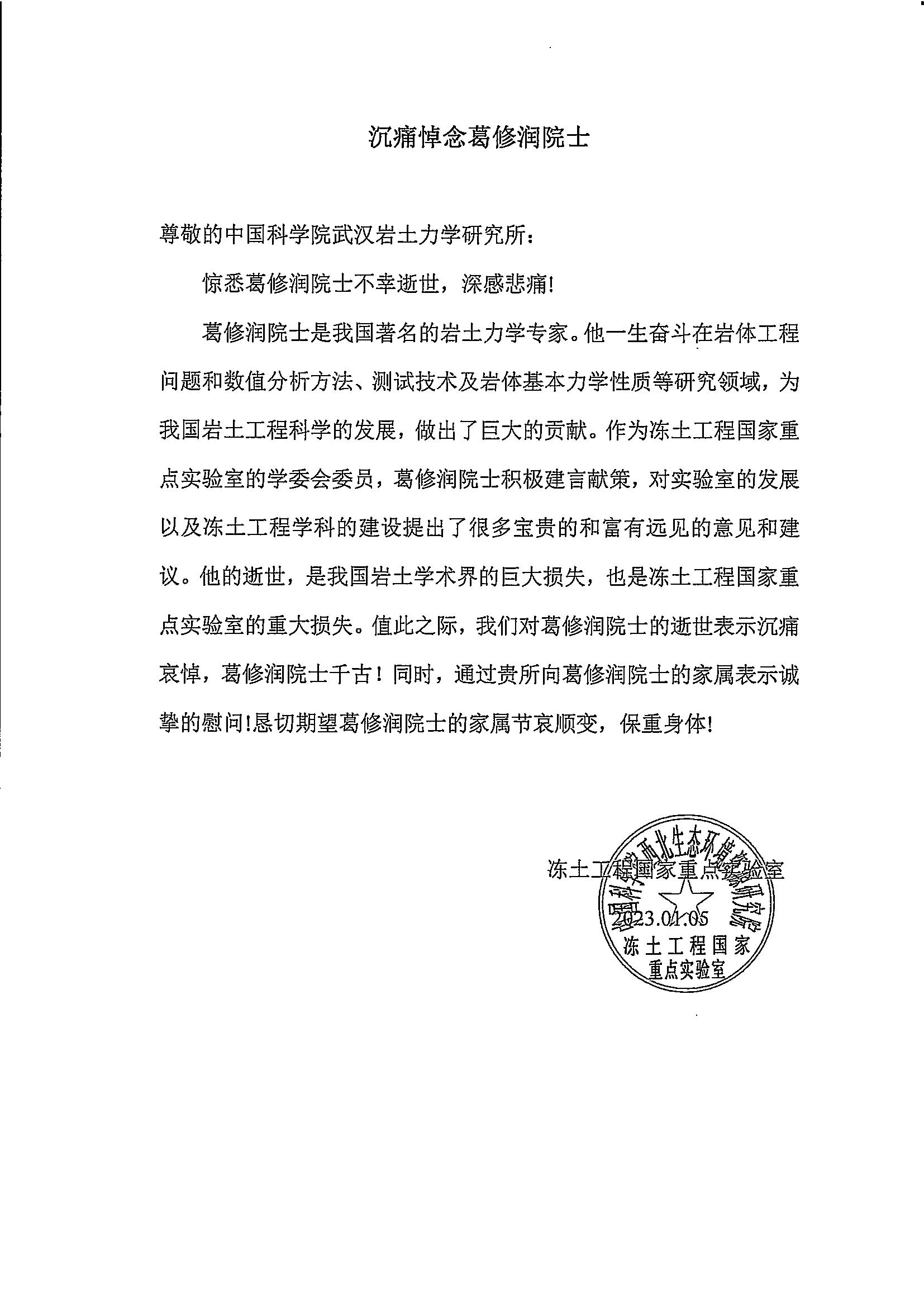 中国科学院西北生态环境资源研究院冻土工程国家重点实验室唁电