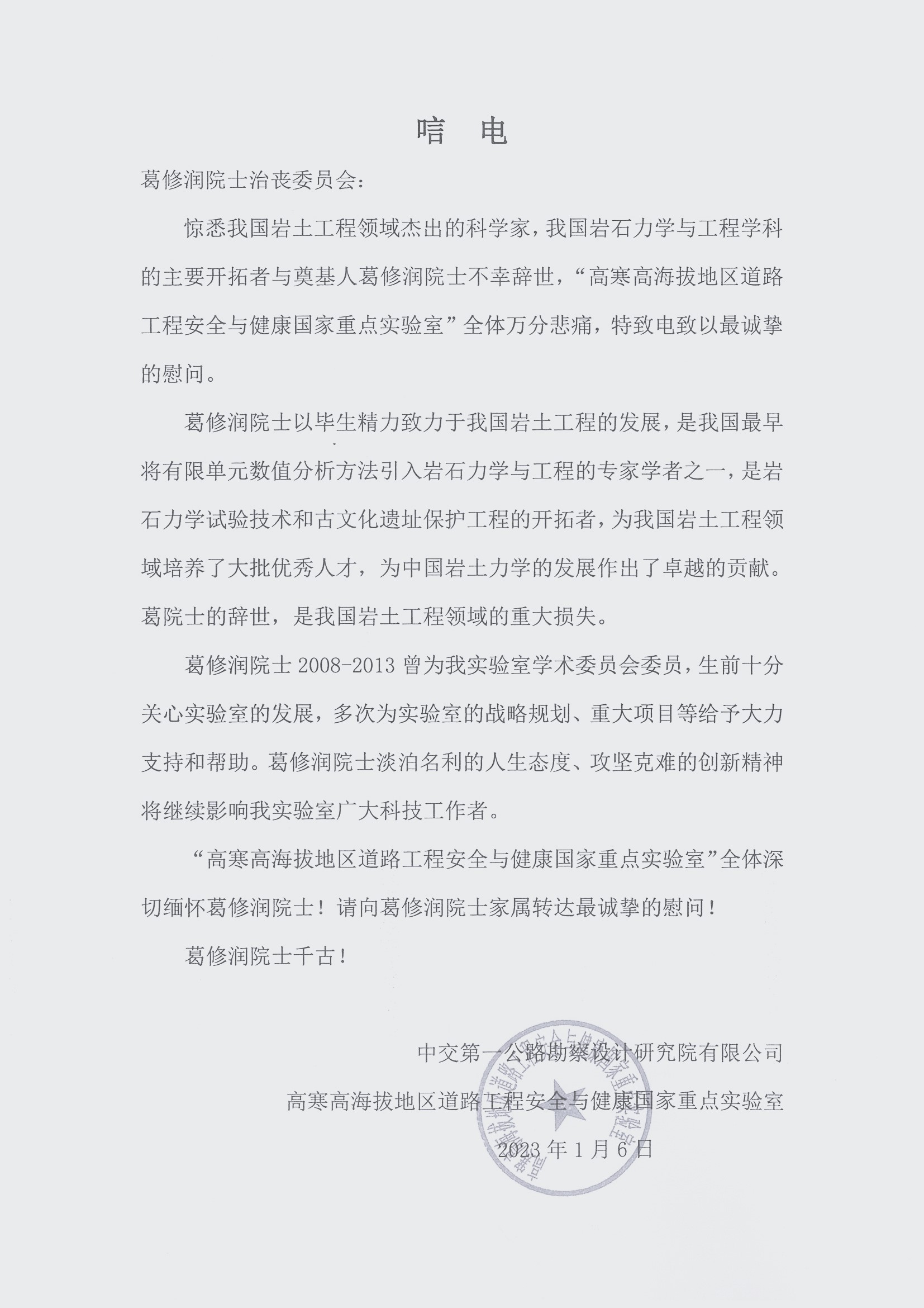 中交第一公路勘察设计研究院有限公司高寒高海拔地区道路工程安全与健康国家重点实验室唁电