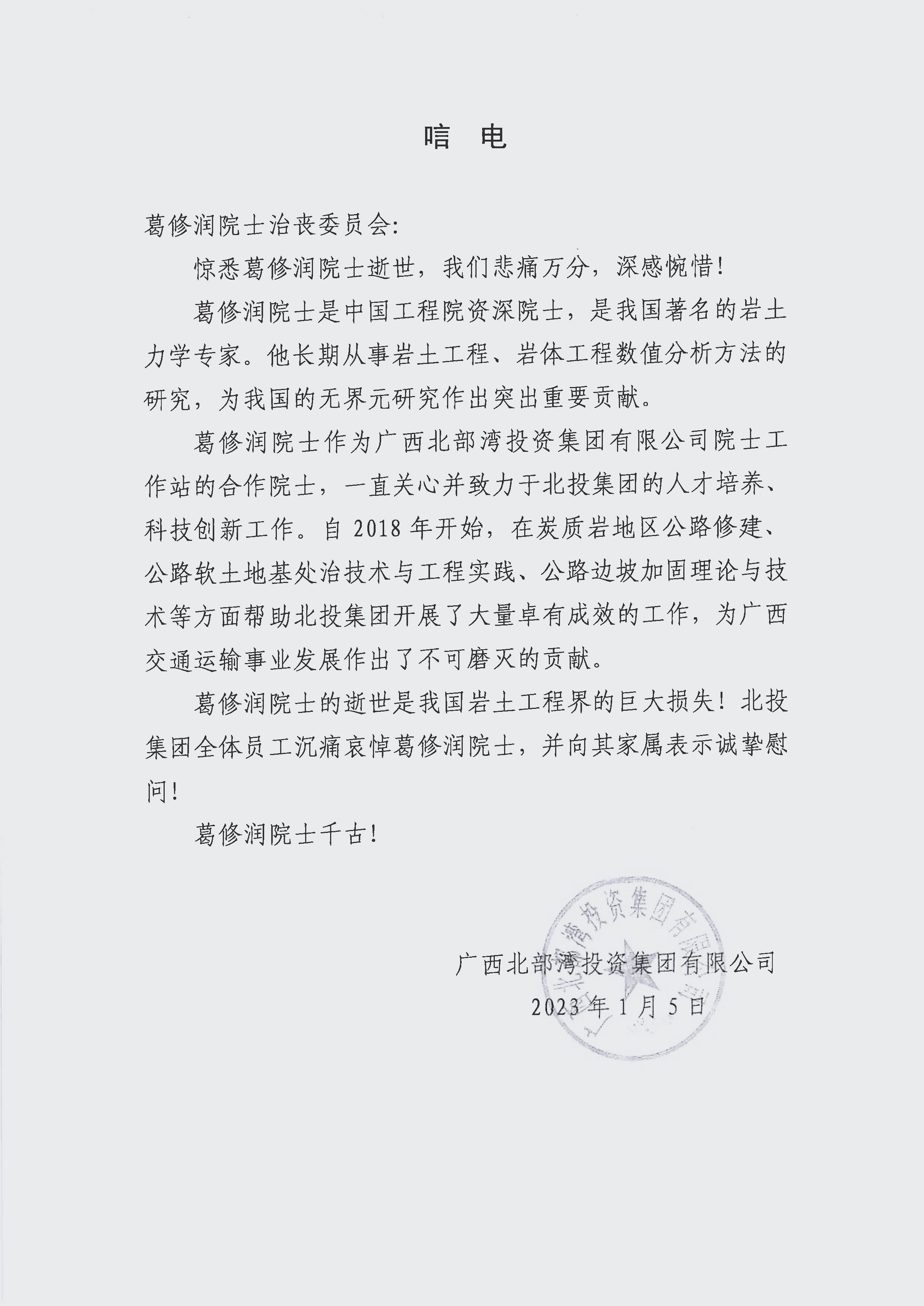 广西北部湾投资集团有限公司唁电