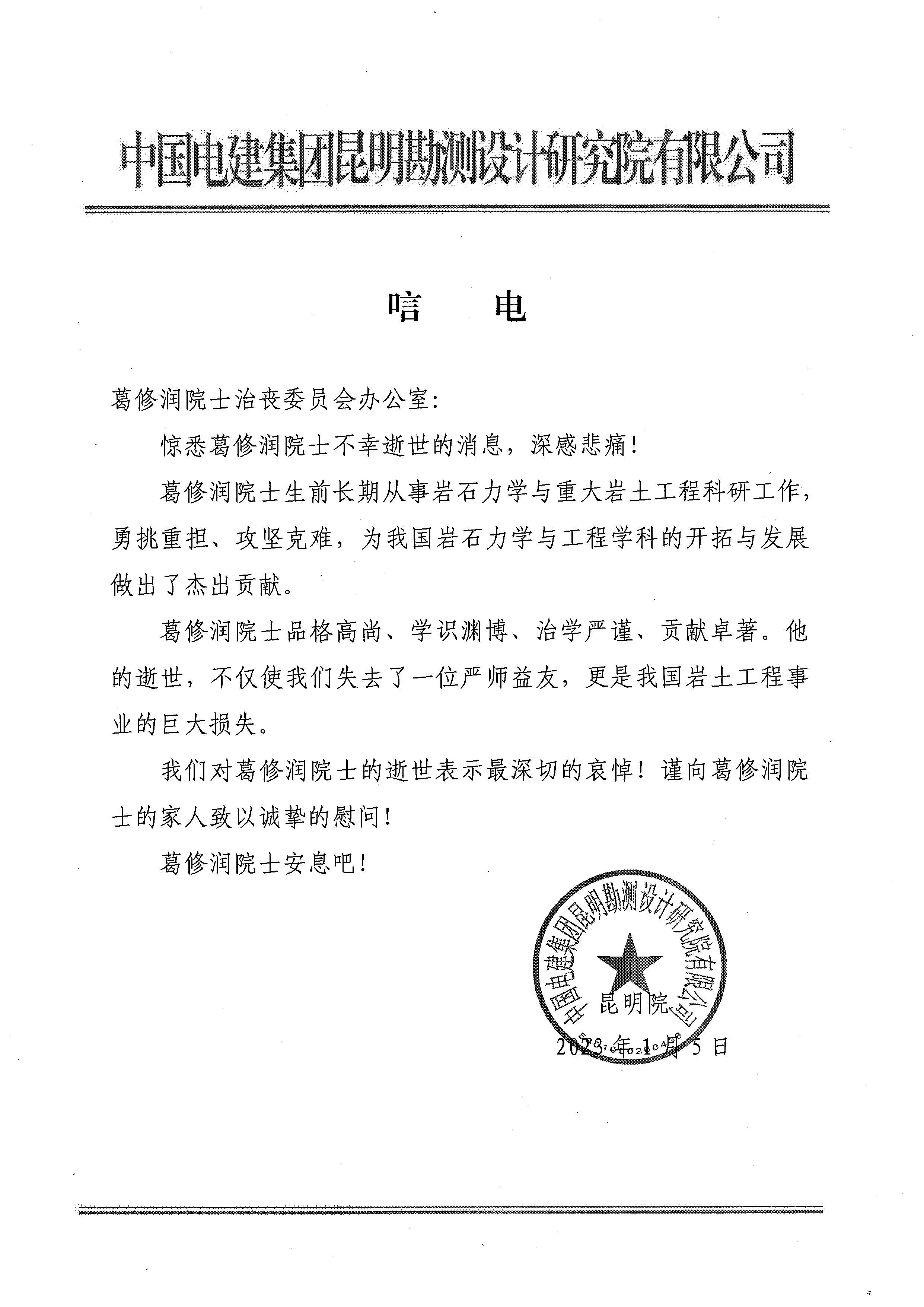 中国电建集团昆明勘测设计研究院有限公司唁电
